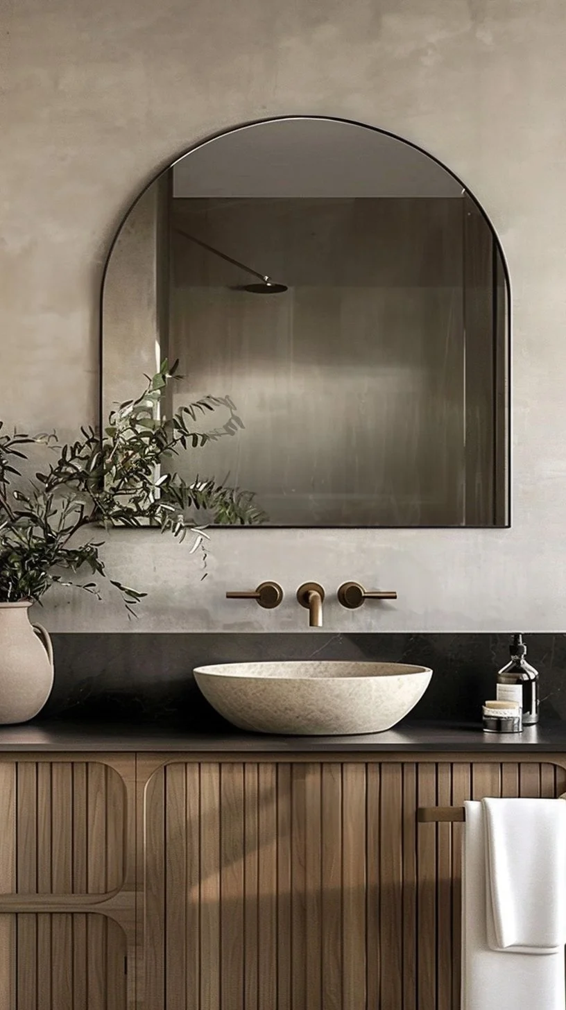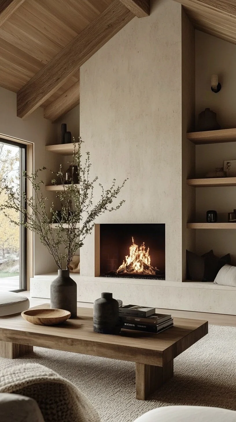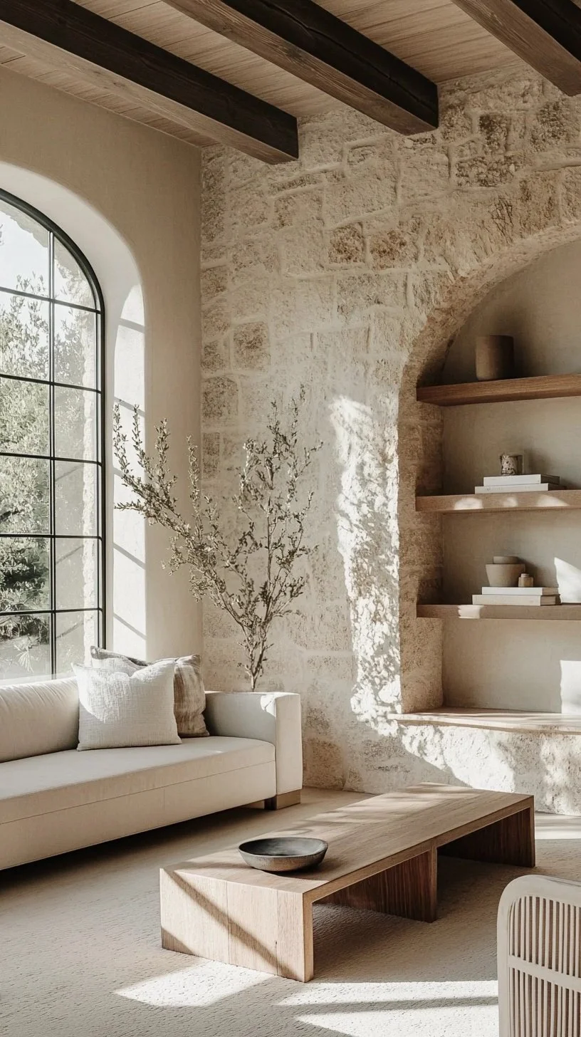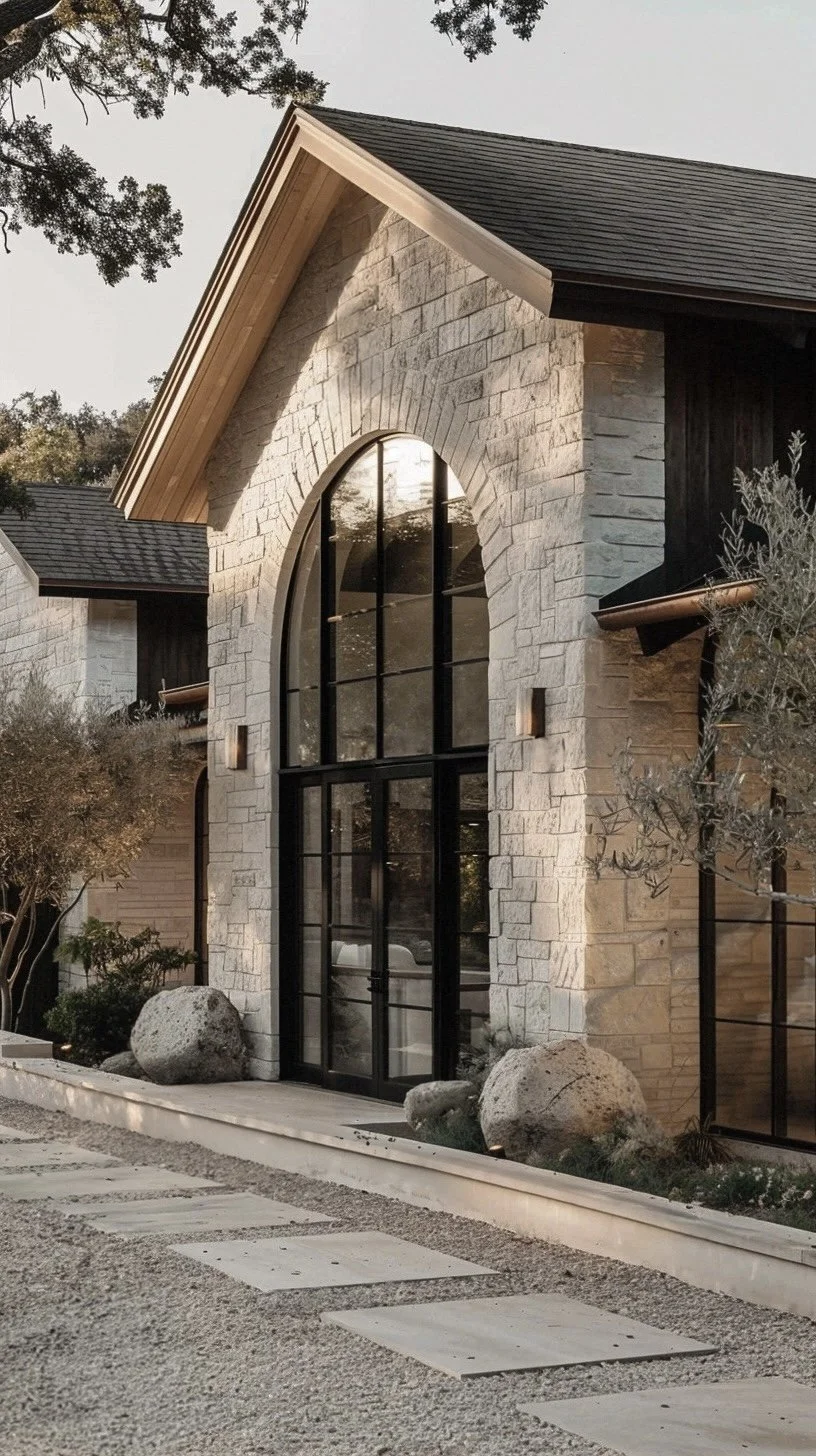 · LIVING ROOM WITH GRAND FLOOR-TO-CEILING STONE FIREPLACE/STAIRWAY WALL, & CUSTOM WHITE OAK ARCHED BUILT-INS